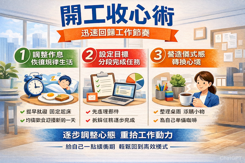 【記者張秀瓊/高雄報導】春節長假結束,2/23大部分企業、公司將正式開工,許多上班族難免出現「收假症候群」,精神不濟、提不起勁,甚至對工作產生倦怠感。面對開工日的到來,心理諮商師兼職場效率顧問王宏志建議,可透過「開工收心術」三步驟,幫助自己迅速調整狀態,重新找回專注與效率。