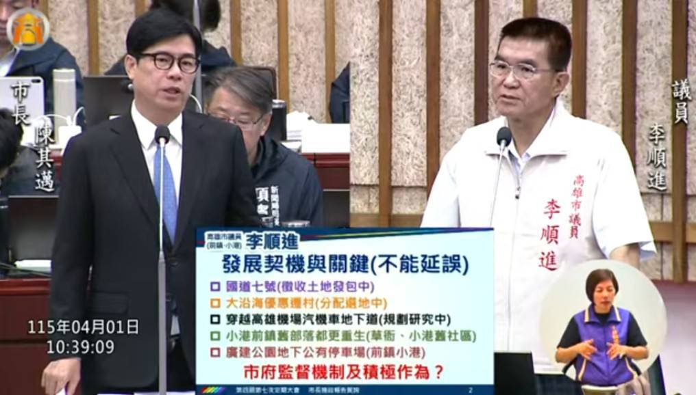 高雄市議員李順進於4月1日議會質詢時表示,高雄要走向國際化,南高雄不能缺席。前鎮與小港擁有港口、機場、產業園區與加工出口區,是高雄與國際接軌的重要門戶,但地方長期面臨交通壅塞、停車不足及基礎建設等問題,若不加速改善,將影響整體城市發展。
